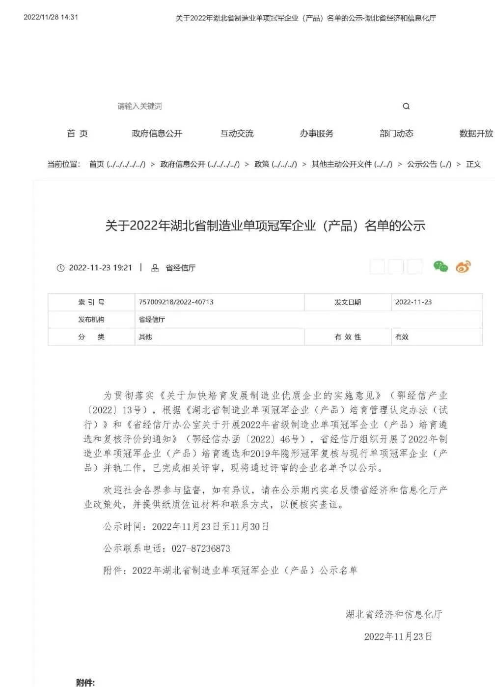 为贯彻落实工业和信息化部等六部委《关于加快培育发展制造业优质企业的指导意见》精神,按照工业和信息化部《制造业单项冠军企业培育提升专项行动实施方案》和省经信厅等七部门《关于加快培育发展制造业优质企业的实施意见》要求,引导我省制造业企业专注于细分产品市场创新、产品质量提升和品牌培育,加快培育优质制造业企业,提升湖北制造业核心竞争力,推动产业迈向中高端,根据《湖北省制造业单项冠军企业(产品)培育管理认定办法(试行)》(鄂经信产业〔2022〕69号),湖北省经信厅组织开展了省级制造业单项冠军企业(产品)培育遴选和复核评价工作,日前公示了《2022年湖北省制造业单项冠军企业(产品)名单》,和记娱乐官网公司光纤环器件产品荣获2022年湖北省制造业单项冠军产品。